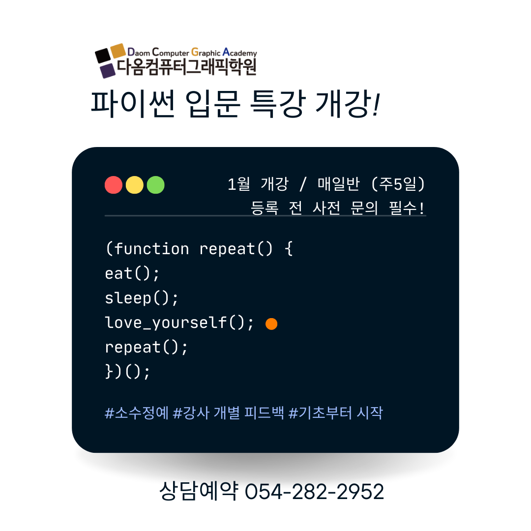 HOME > 커뮤니티 > 공지사항| 1월 19일 개강▶ 파이썬/C언어 기초/JAVA | Date 2026.01.14HIT 4526 | |